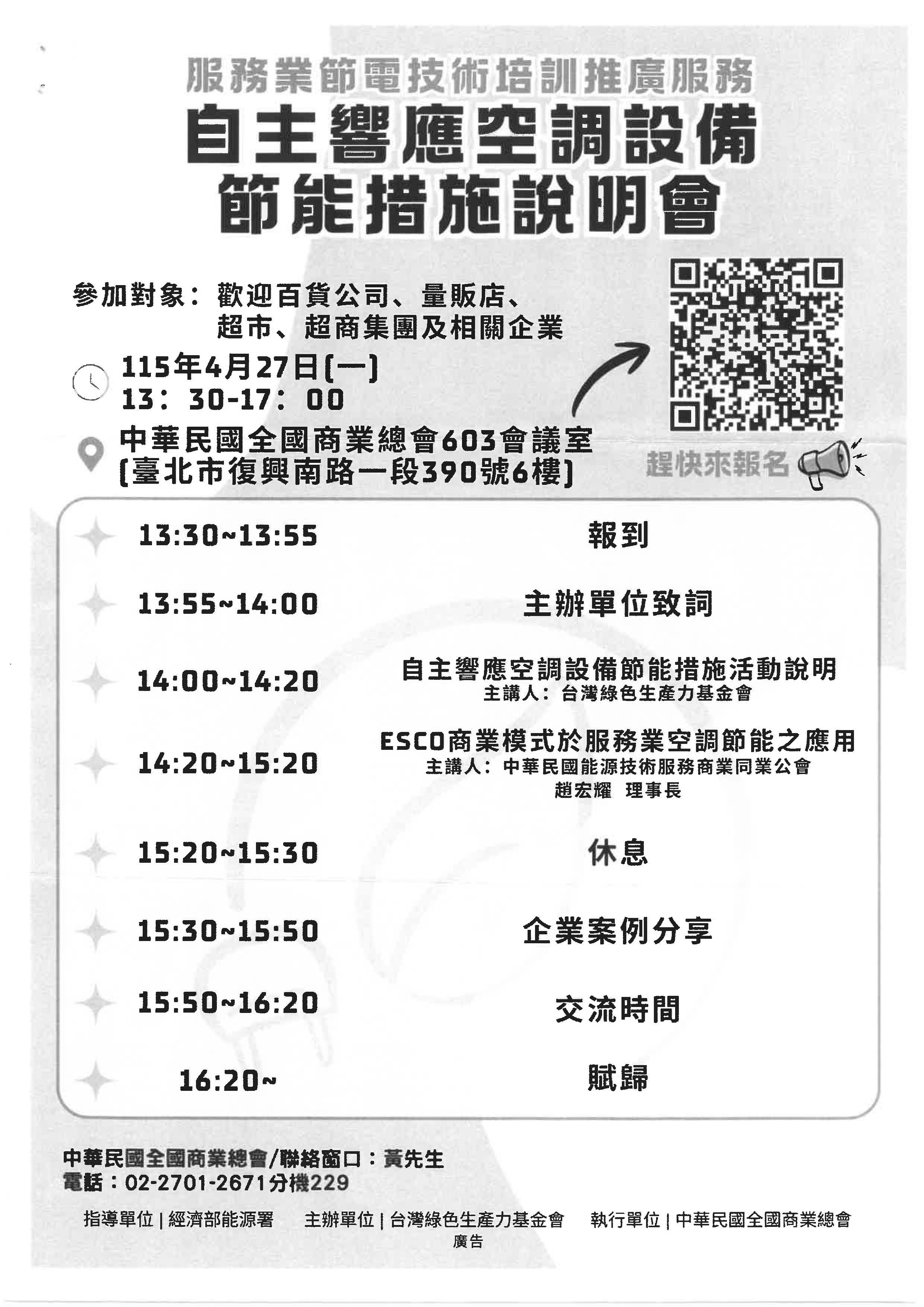 函轉中華民國全國商業總會為推動百貨公司、量販店丶超市、超商集圍及相關企業響應空調設備節能措施, 以提高業者了解節電重要性的意識感,敬邀 參加 「空調設備節能措施說明會」
