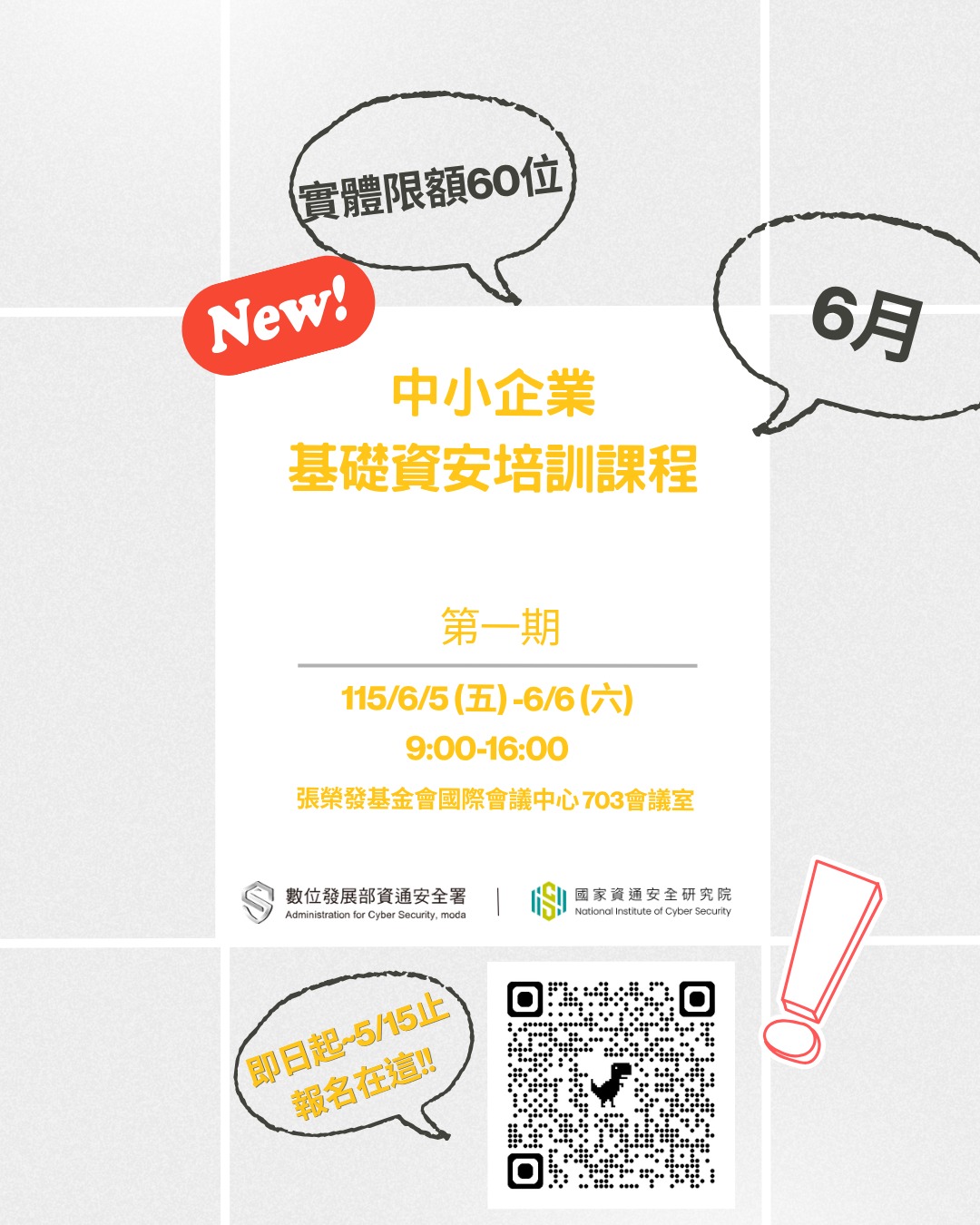 2026-04-22 115年中小企業基礎資安培訓課程 函轉經濟部中小及新創企業署,數位發展部資通安全署「115年中小企業基礎資安培訓課程」活動資訊,請協助轉知中小企業踴躍報名參與。 【中小企業基礎資安培訓課程:從勒索病毒防禦到核心資料保護】 在資安威脅如風浪般接踵而來的時代,企業最需要的不是運氣,而是面對風險的底氣與實力! 本年度課程由資安署與資安院聯手打造,針對中小企業常見痛點,規劃兩天精實的「資安修煉」,陪您從防禦思維進階到實戰應變: DAY 1|勒索病毒:不給錢就搗蛋? 別讓勒索病毒成為企業營運的絆腳石。我們將帶您深入拆解駭客的入侵路徑與常見破口,了解敵人如何進場,就能在威脅來襲時從容應對、掌握主動權。 DAY 2|資料保護:守護企業的心臟 客戶隱私與企業機密是經營的重心。從風險盤點切入實戰演練,幫助學員將應變流程內化為直覺反應。讓資安防護不再只是口號,而是企業在風浪中依然能雲淡風輕的關鍵。 【課程資訊】 第一期 (6月場): 115/6/5 (五) - 6/6 (六) 第二期 (7月場): 115/7/17 (五) - 7/18 (六) 時間: 09:00 - 16:00 地點: 張榮發基金會國際會議中心 【報名期限】即日起至 5/15 止,名額有限,額滿即截止! 【報名需知】 • 實體課程:每期員額限定 60 名,以中小企業決策主管為優先。 • 線上直播:第二期加開線上直播,不限名額及身份。 立刻卡位報名: https://forms.gle/Uhy49XR2U3uTTQ4m8 回上一頁