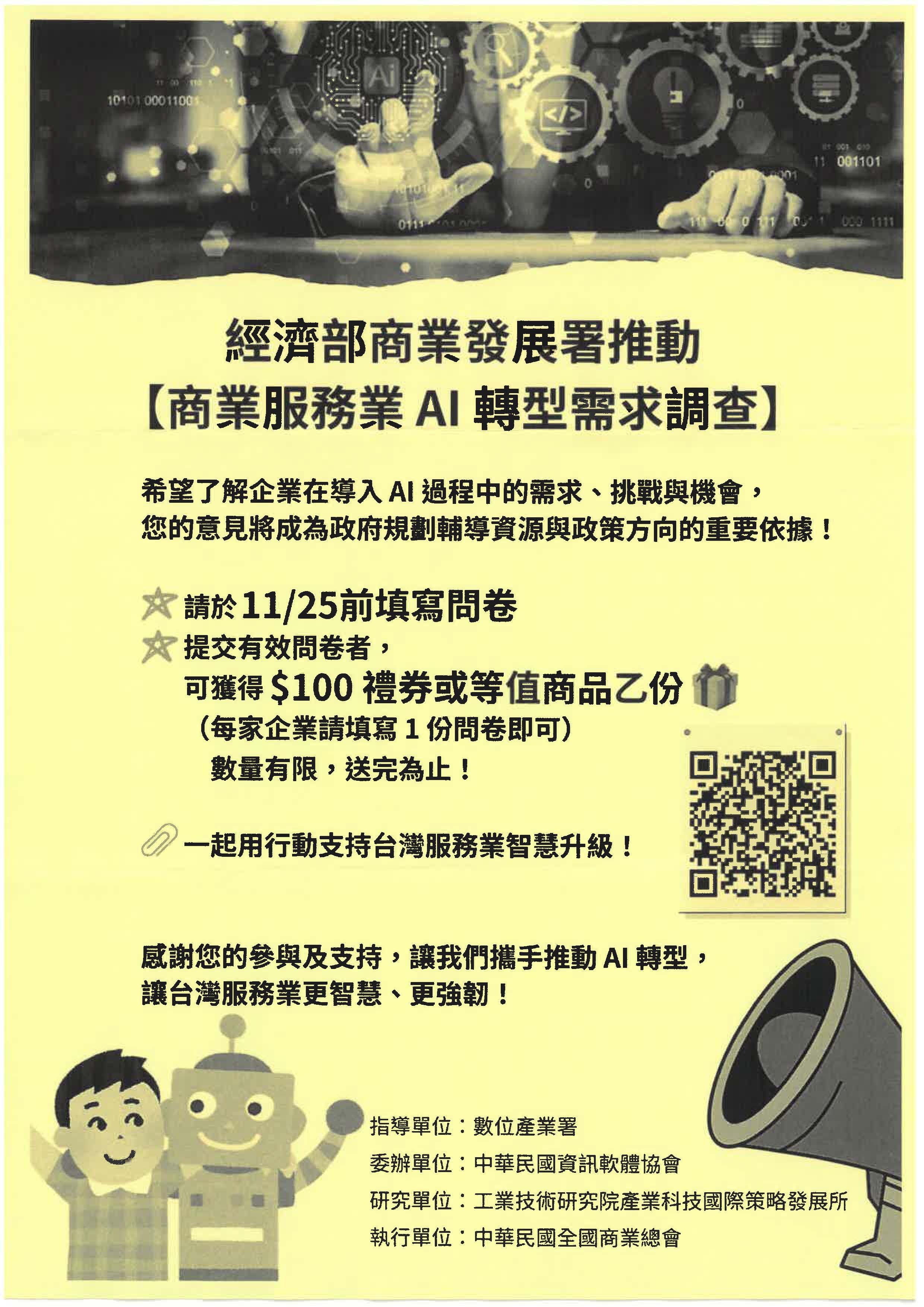 2025-11-24 「商業服務業AI轉型需求調查」 函轉中華民國全國商業總會,檢送「商業服務業AI轉型需求調查」間卷宣傳文案乙份,敬請各會員單位惠予公告周知,並鼓勵相關企業填寫問卷。 經濟部商業發展署正進行「商業服務業AI轉型需求調查」, 旨在了解企業導入 AI 的需求及過程中所面臨的挑戰。敬請填寫間卷以提供政府資源之參考依據, 有效間卷填答者可獲得新臺幣 100 元禮券或等值禮品。詳情請參考以下宣傳文案。 聯絡人:黃小姐,電話: (02)2701-2671 分機 306 。 回上一頁