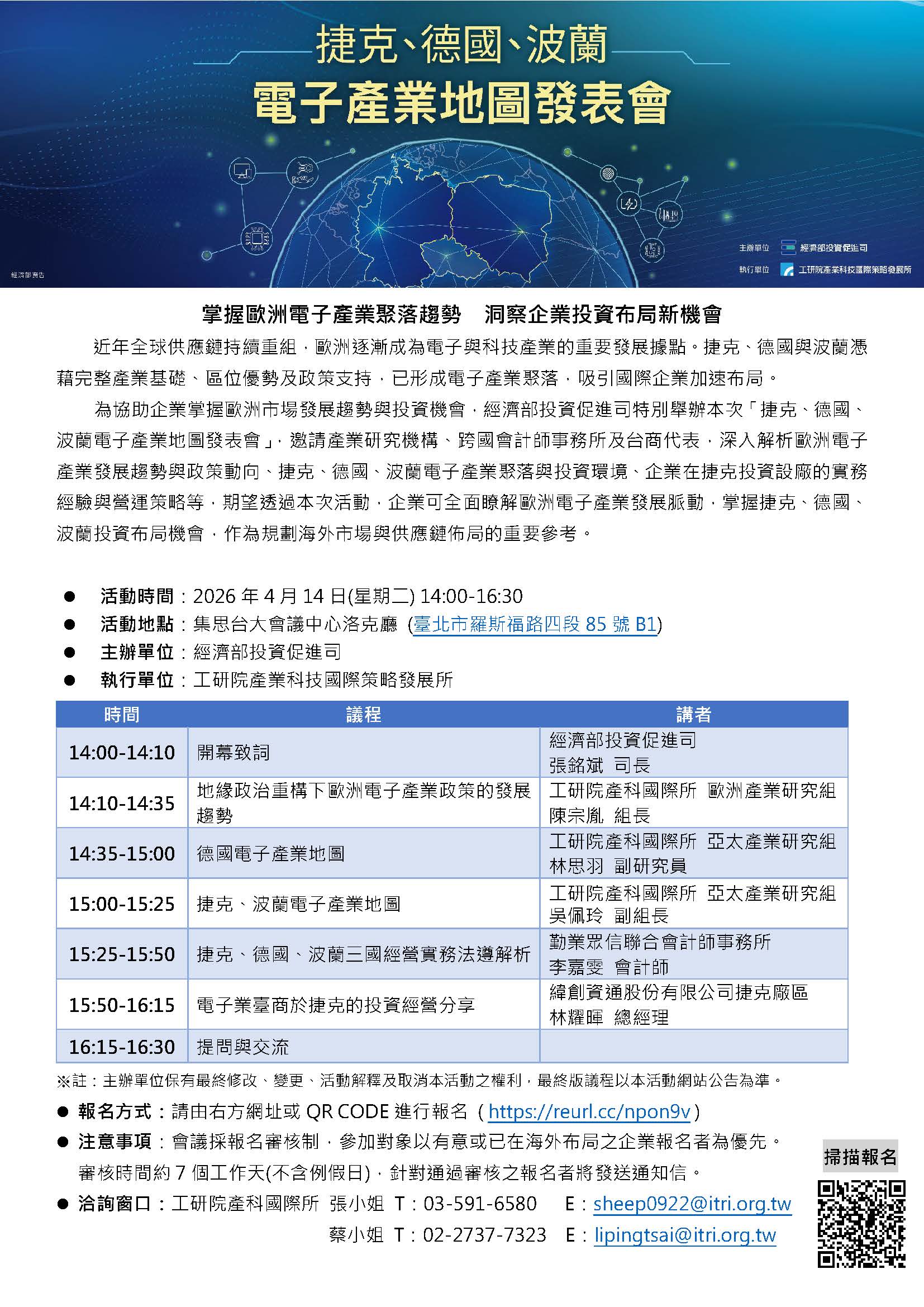 函轉財團法人工業技術研究院訂於本(115)年4月14日辦理「捷克、德國、波蘭電子產業地圖發表會」 ,檢送活動資訊一份,敬請公告並協助轉知會員,敬邀會員廠商報名參與。