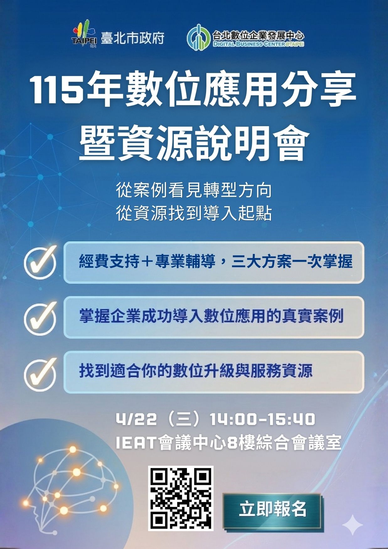 函轉臺北市政府產業發展局,產業發展局台北數位企業發展中心訂於115年4 月 22 日辦理 「台北市數位應用分享會暨資源說明會」 ,惠請協助宣傳周知。