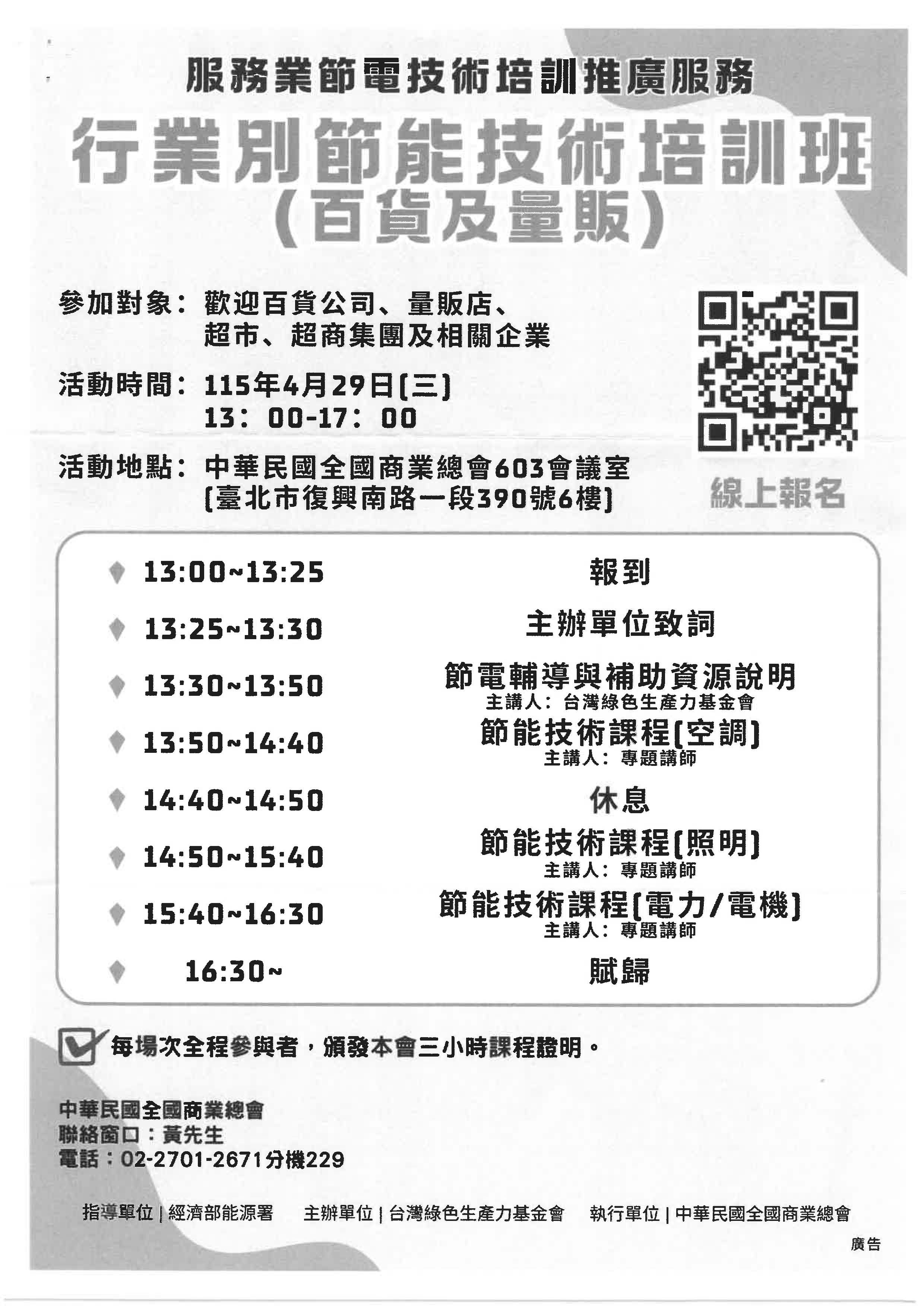 及推廣百貨及量販、大專院校、醫療院所及辦公大樓等相關產業節能技術,特舉辦「行業別節能技術培訓班」課程,敬請派員報名參加。