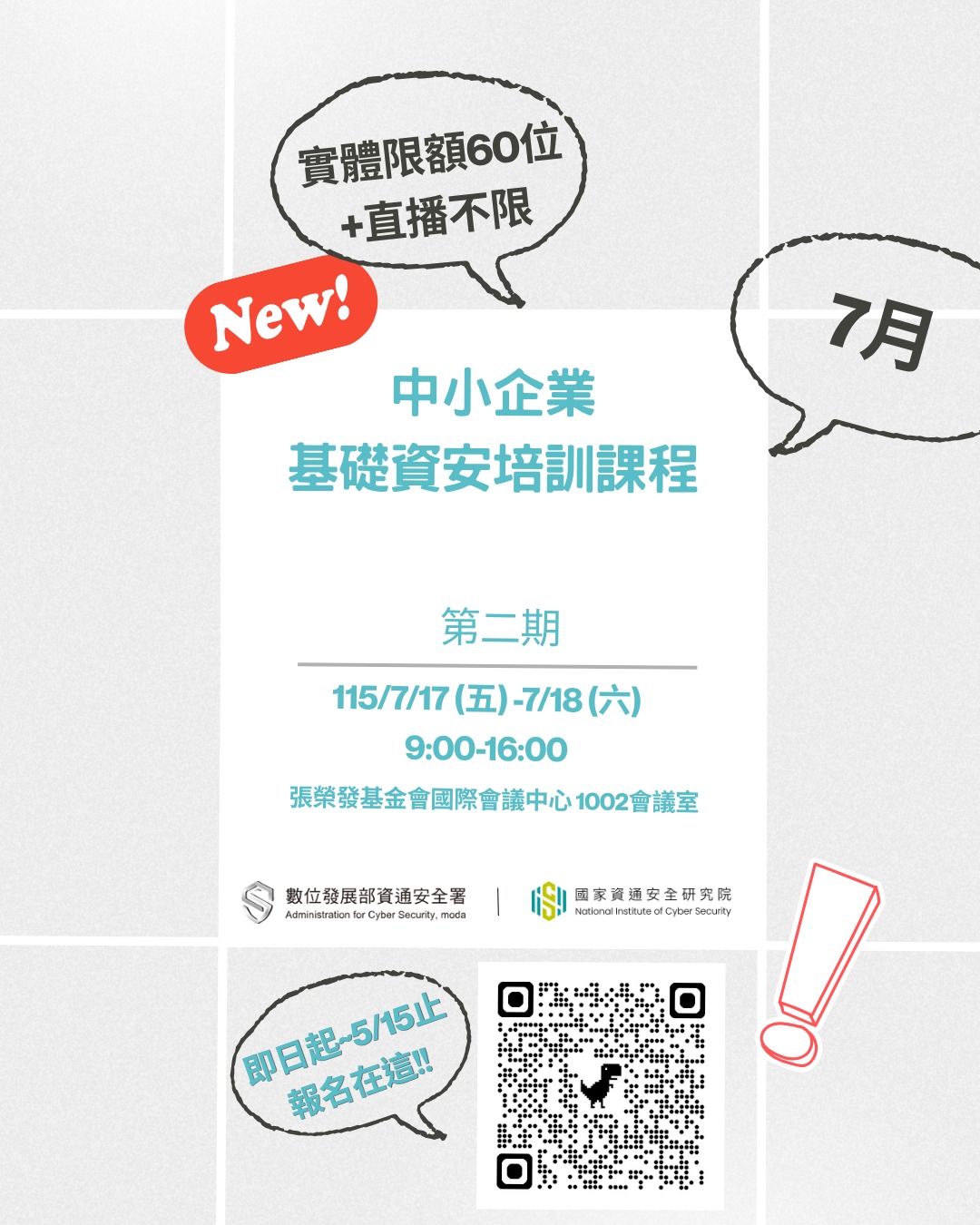 2026-04-22 115年中小企業基礎資安培訓課程 函轉經濟部中小及新創企業署,數位發展部資通安全署「115年中小企業基礎資安培訓課程」活動資訊,請協助轉知中小企業踴躍報名參與。 【中小企業基礎資安培訓課程:從勒索病毒防禦到核心資料保護】 在資安威脅如風浪般接踵而來的時代,企業最需要的不是運氣,而是面對風險的底氣與實力! 本年度課程由資安署與資安院聯手打造,針對中小企業常見痛點,規劃兩天精實的「資安修煉」,陪您從防禦思維進階到實戰應變: DAY 1|勒索病毒:不給錢就搗蛋? 別讓勒索病毒成為企業營運的絆腳石。我們將帶您深入拆解駭客的入侵路徑與常見破口,了解敵人如何進場,就能在威脅來襲時從容應對、掌握主動權。 DAY 2|資料保護:守護企業的心臟 客戶隱私與企業機密是經營的重心。從風險盤點切入實戰演練,幫助學員將應變流程內化為直覺反應。讓資安防護不再只是口號,而是企業在風浪中依然能雲淡風輕的關鍵。 【課程資訊】 第一期 (6月場): 115/6/5 (五) - 6/6 (六) 第二期 (7月場): 115/7/17 (五) - 7/18 (六) 時間: 09:00 - 16:00 地點: 張榮發基金會國際會議中心 【報名期限】即日起至 5/15 止,名額有限,額滿即截止! 【報名需知】 • 實體課程:每期員額限定 60 名,以中小企業決策主管為優先。 • 線上直播:第二期加開線上直播,不限名額及身份。 立刻卡位報名: https://forms.gle/Uhy49XR2U3uTTQ4m8 回上一頁