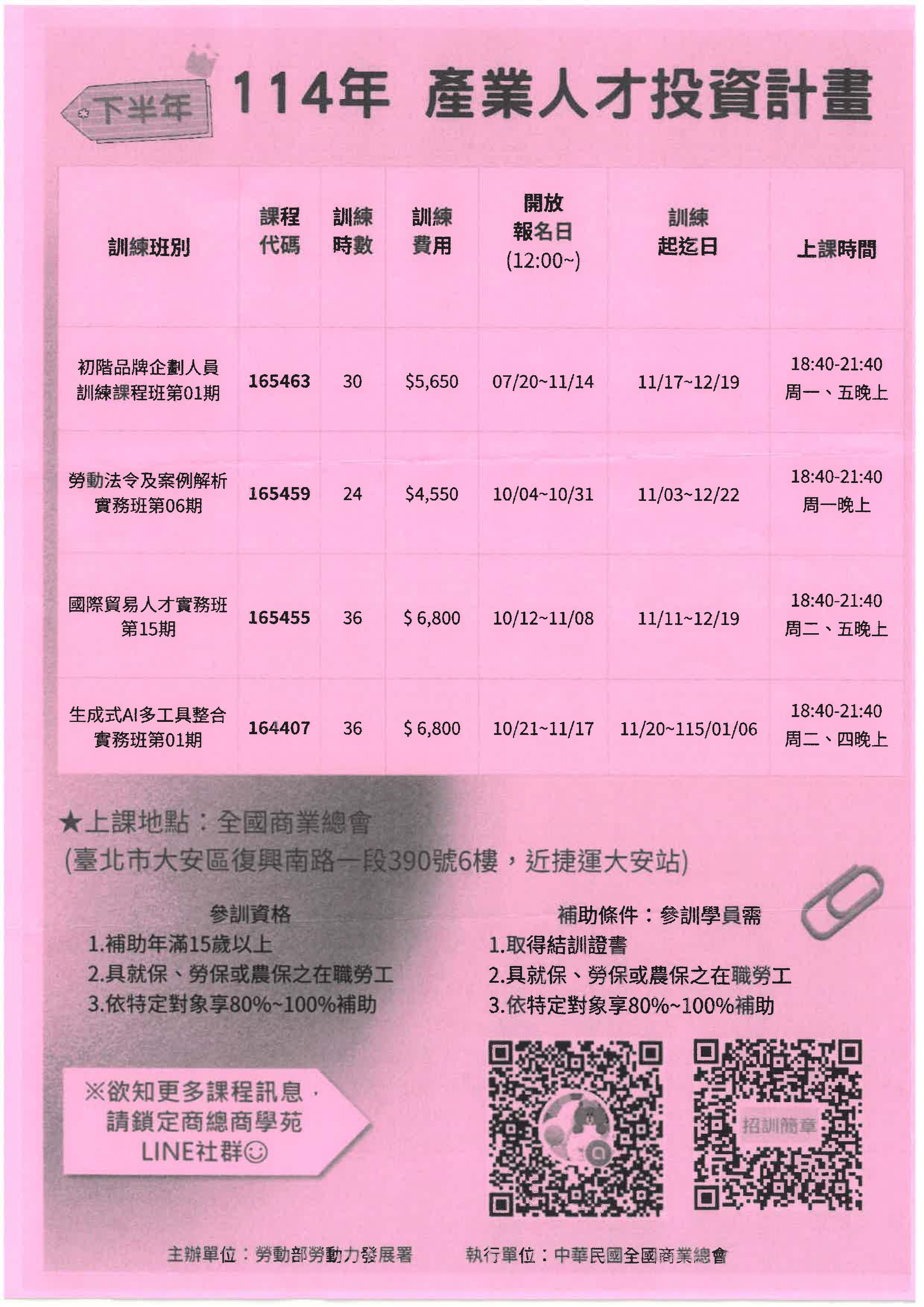 函轉中華民國全國商業總會「114年產業人才投資計畫」下半年課程招生簡章乙份,名額有限,請轉知貴屬會員踴躍報名。