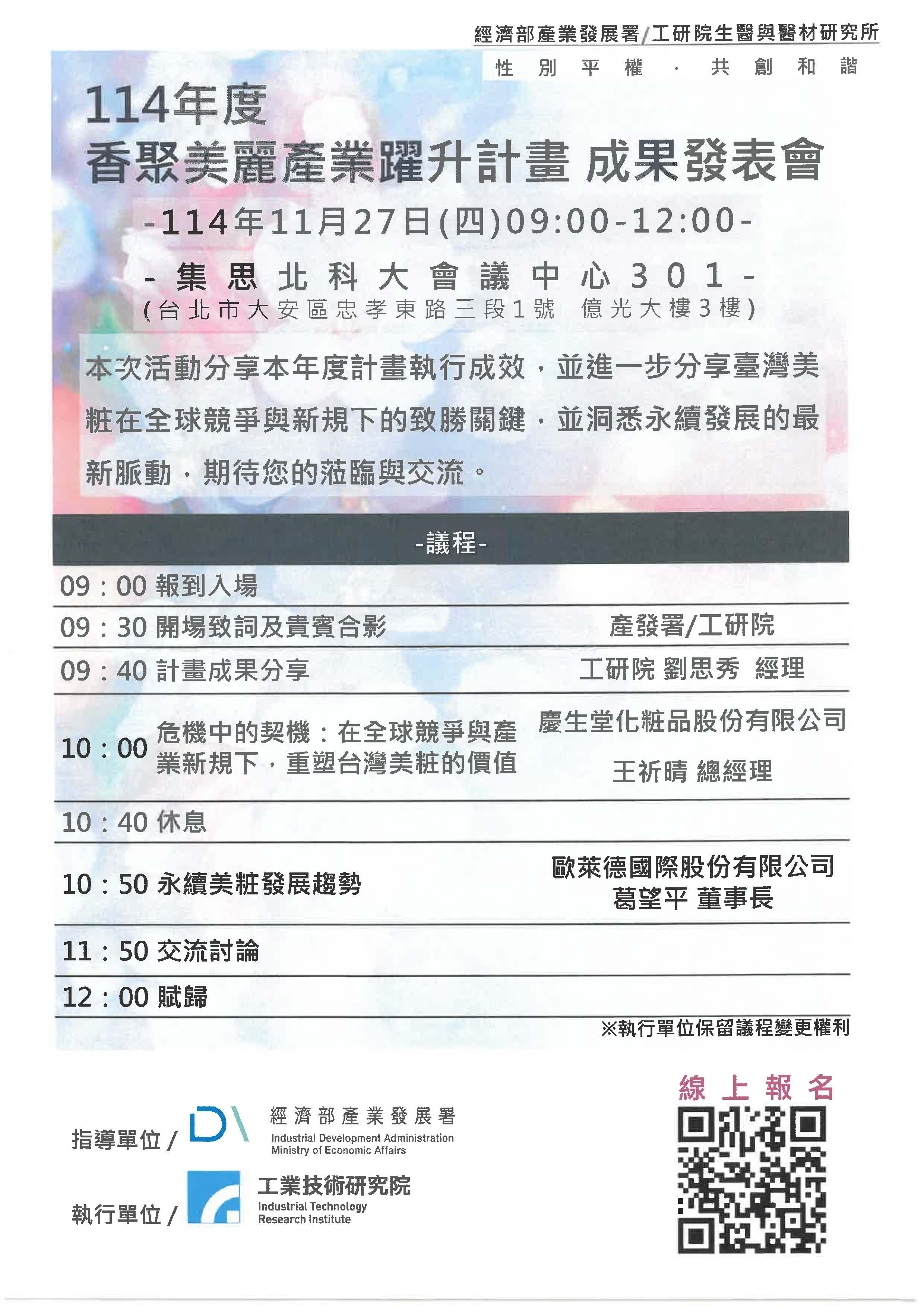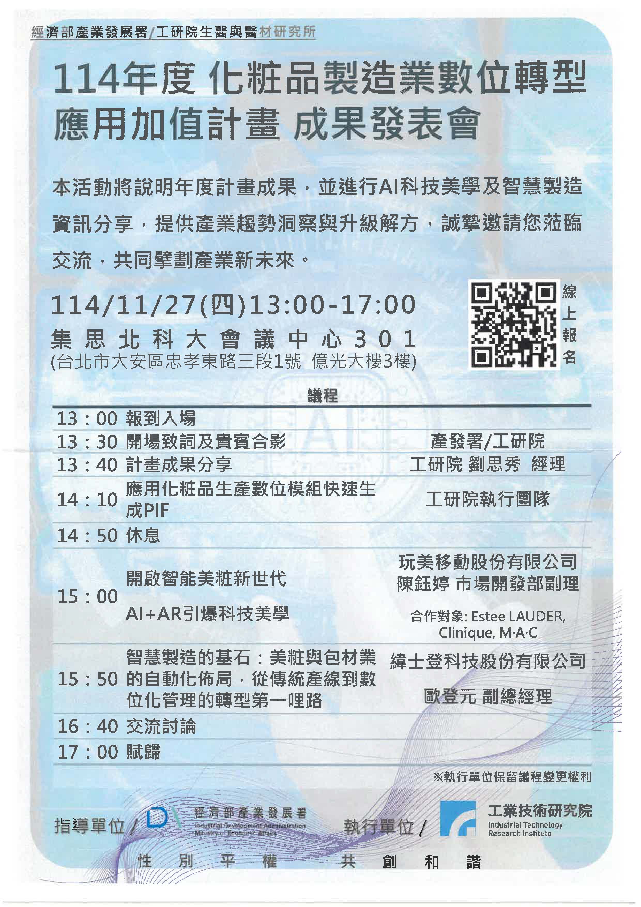 函轉財團法人工業技術研究院114年11月27日(星期四)上午辦理 「 114 年度香聚美麗產業躍升計畫成果發表會」 ,下午辦理 「 114 年度化粧品製造業數位轉型應用加值計畫成果發表會」,